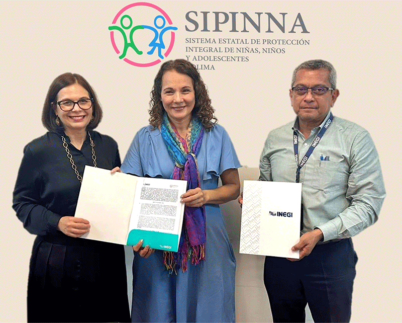 El 3 de octubre, se firmó el convenio de colaboración entre el Sistema Estatal de Protección de Niñas, Niños y Adolescentes (Sipinna) del estado de Colima y el INEGI. Este acuerdo fue suscrito por Esmeralda Cárdenas, secretaria ejecutiva del Sipinna en la entidad, y María del Socorro Gómez, directora regional Occidente.